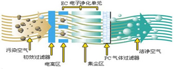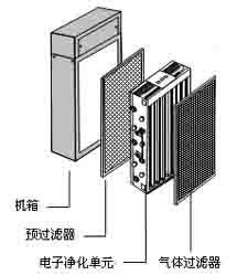 电子净化单元:去除空气中直径为0.3微米以上的微粒,如灰尘、花粉、香烟味、厨房油烟和细菌等